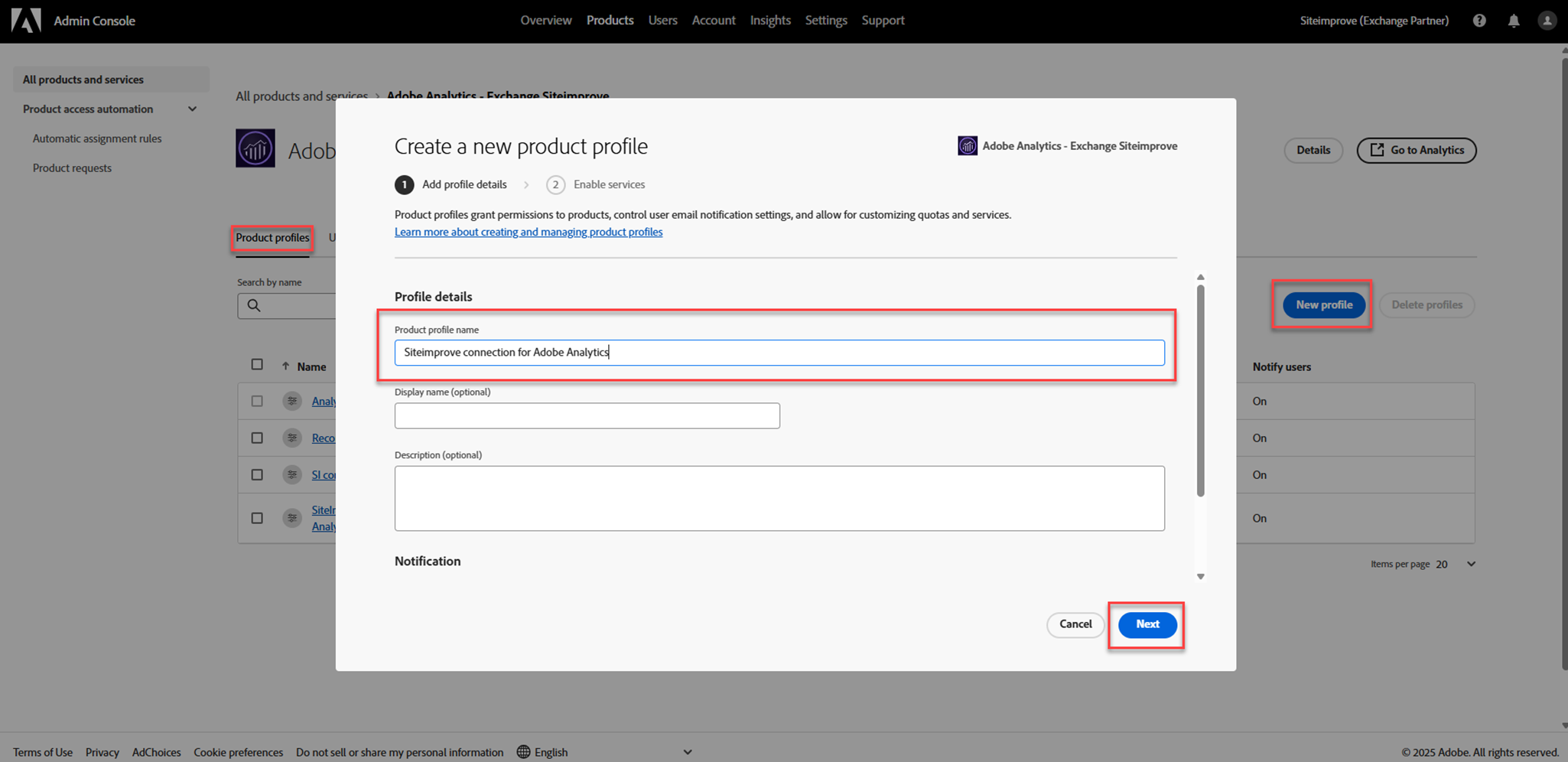 - Enter the Product profile name of Siteimprove connection for Adobe Analytics and optionally a Display name and a Description then select Next.