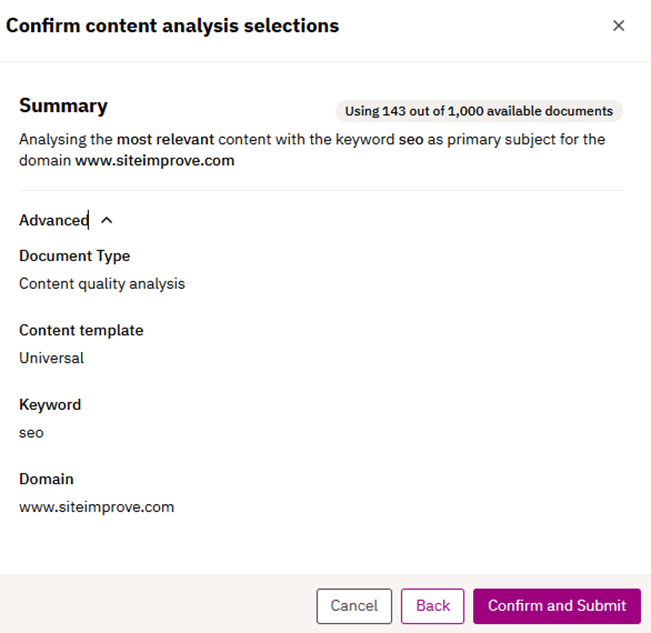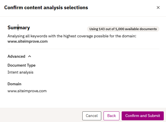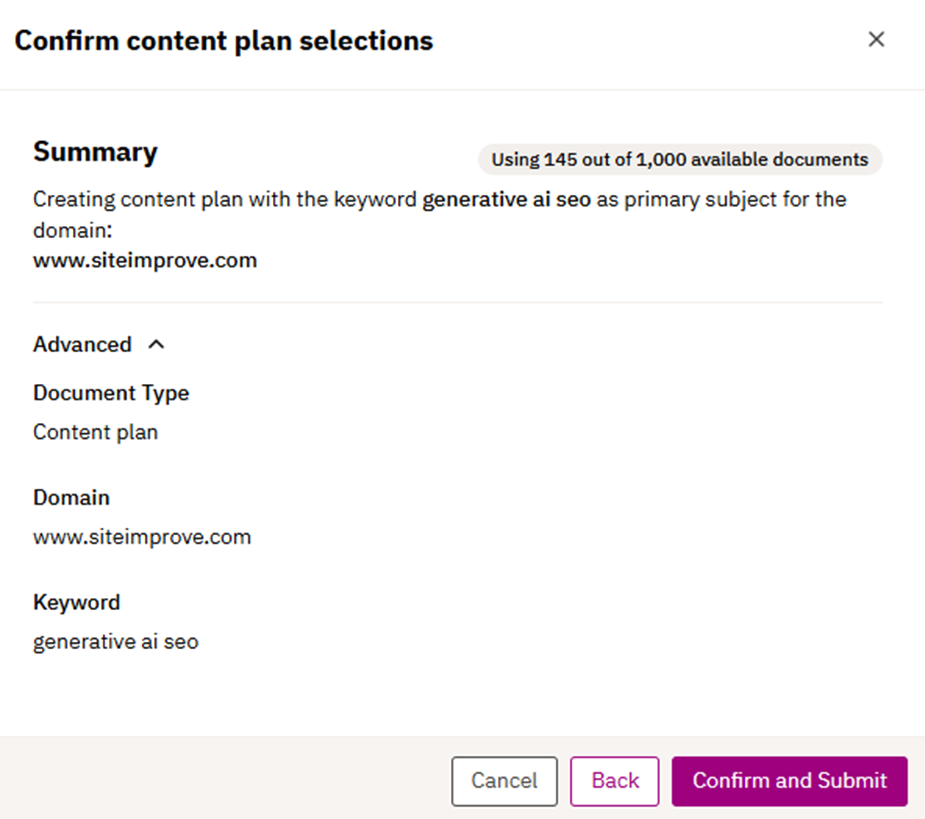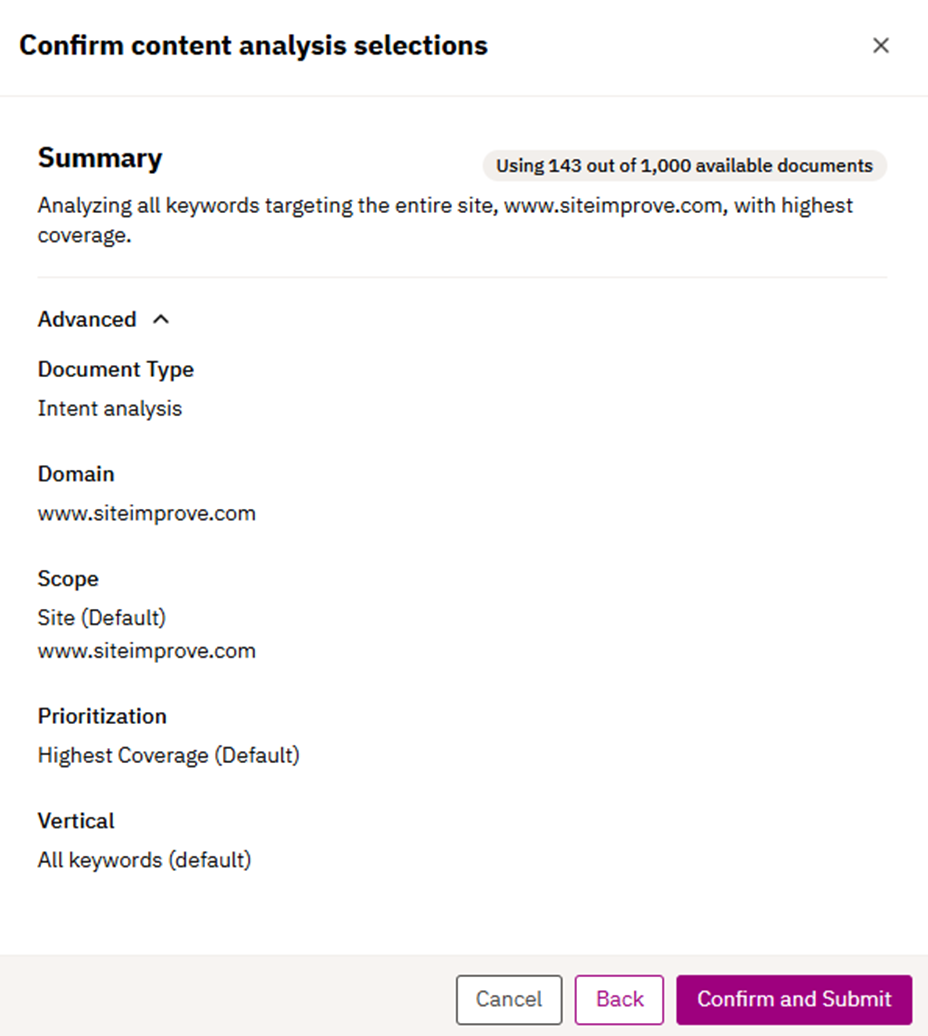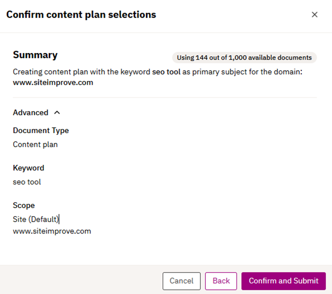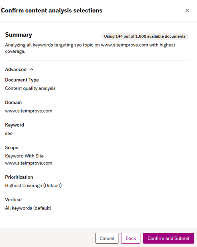 3.2.3 The user confirms the content plan selection from the previous step. “Advanced” is collapsed by default, to not confuse the user with unnecessary data points, but can be expanded to understand the scope of the analysis.