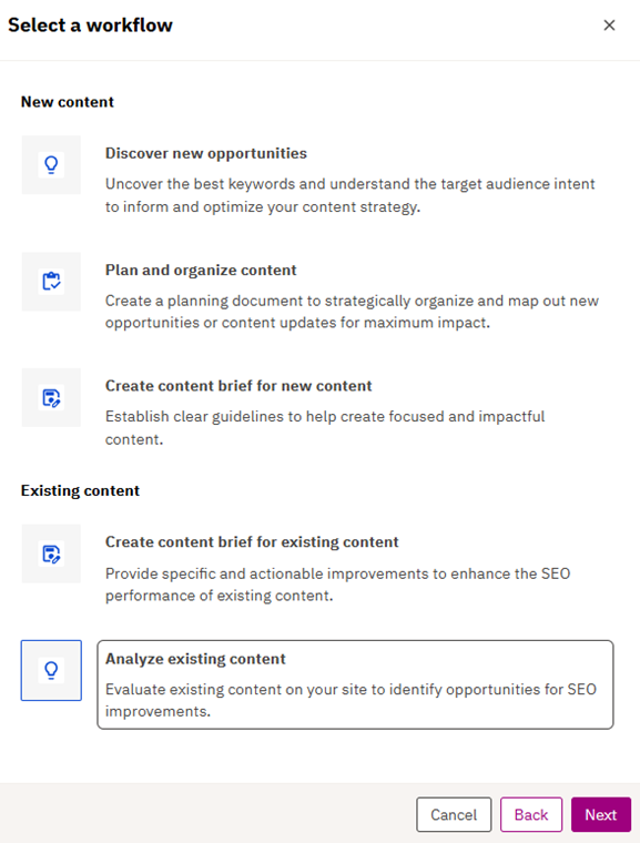3. As the next step, the user has a choice between 2 actions in the Quick content creation workflow specifically for the Content Analysis workflow: Discover new opportunities or Analyze existing content