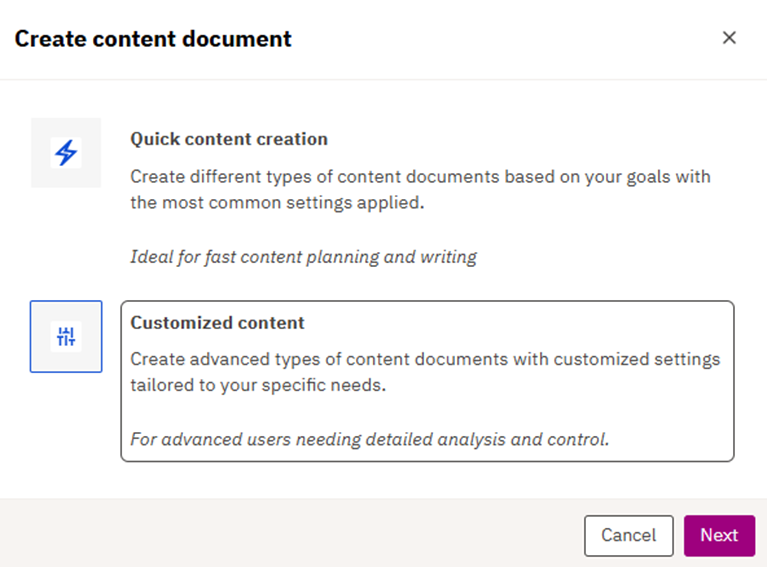 2. A modal will appear that will offer the user 2 choices: Quick content creation and Customized content. For this specific action, the user will choose customized creation.
