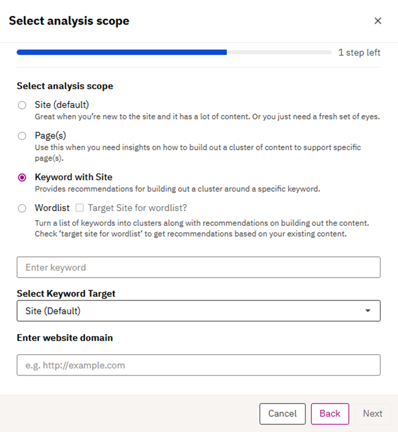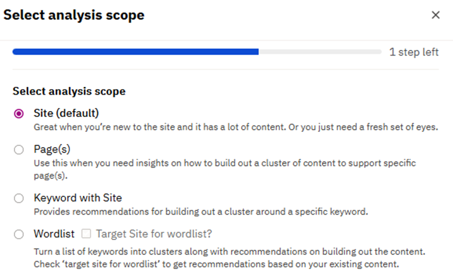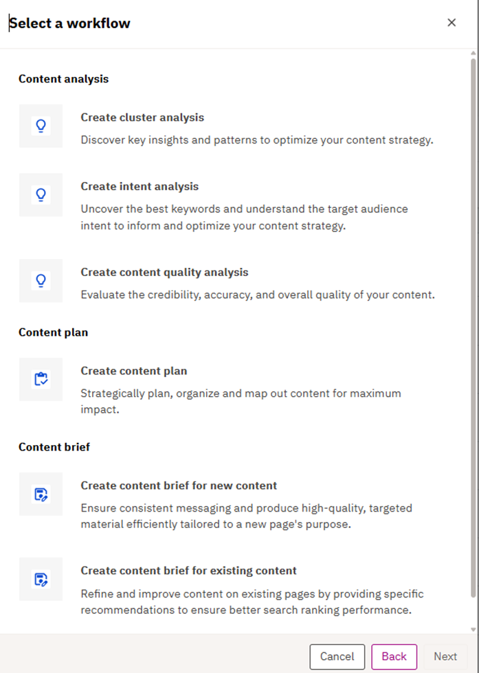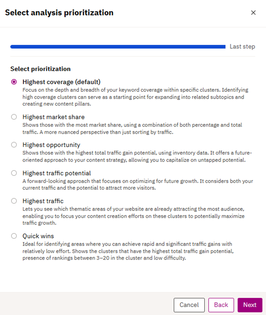 They help marketers understand opportunities and decide what to pursue. You can run three types of analyses: cluster analysis to group related topics/keywords and surface recommendations, keyword/intent analysis to group opportunities by audience intent, and content quality analysis to evaluate the credibility and accuracy of existing content. Options for scope (page, pages, site, topic, word lists) let you analyze anything from a single URL to an entire domain. Prioritization settings (e.g., highest coverage clusters, highest market share clusters, or quick win clusters) ensure that the output aligns with business goals.