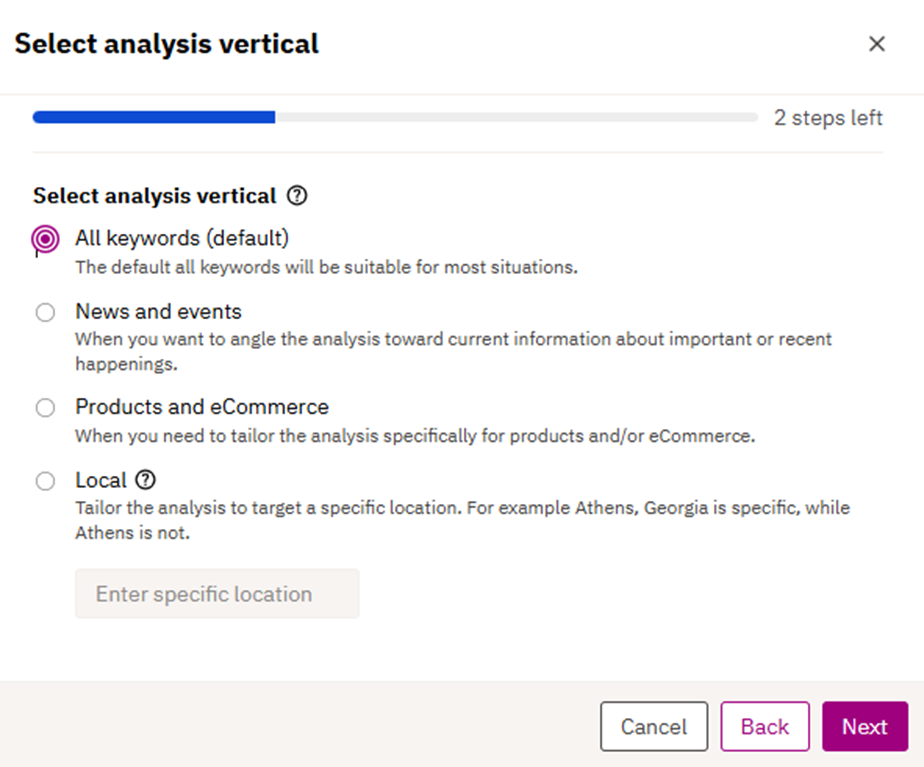 3.3.1 User is prompted to select the existing analysis vertical they want to pursue based on the options available in the modal below. The default (all keywords) will be suitable for most situations. To capture specific nuances, you can set the vertical for one of these common content situations: News/Events, Local, Product/eCommerce:
