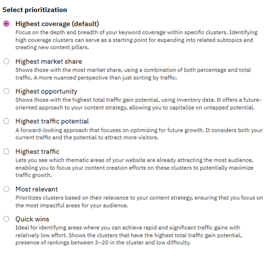Prioritizes clusters based on their relevance to your content strategy, ensuring that you focus on the most impactful areas for your audience.
