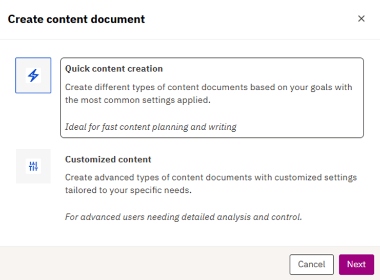 2. A modal will appear that will offer the user 2 choices: Quick content creation and Customized content. For this specific action, the user will choose quick content creation.