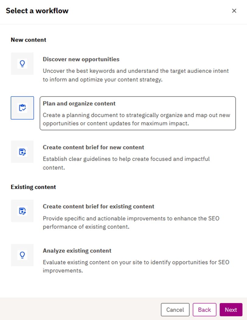 3. As the next step, the user needs to choose the following action in the Quick content creation workflow: Plan and organize content to strategically organize and map out new opportunities or content updates for maximum impact.