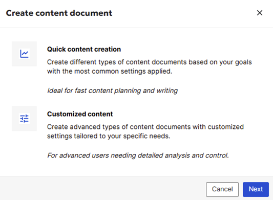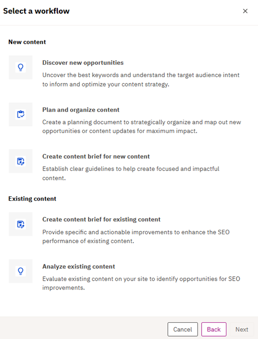 3. Choose the type of content brief you want to create. Next, you’ll be asked to select one of two options in the Quick Content Creation workflow: Create content brief for new content or create content brief for existing content.