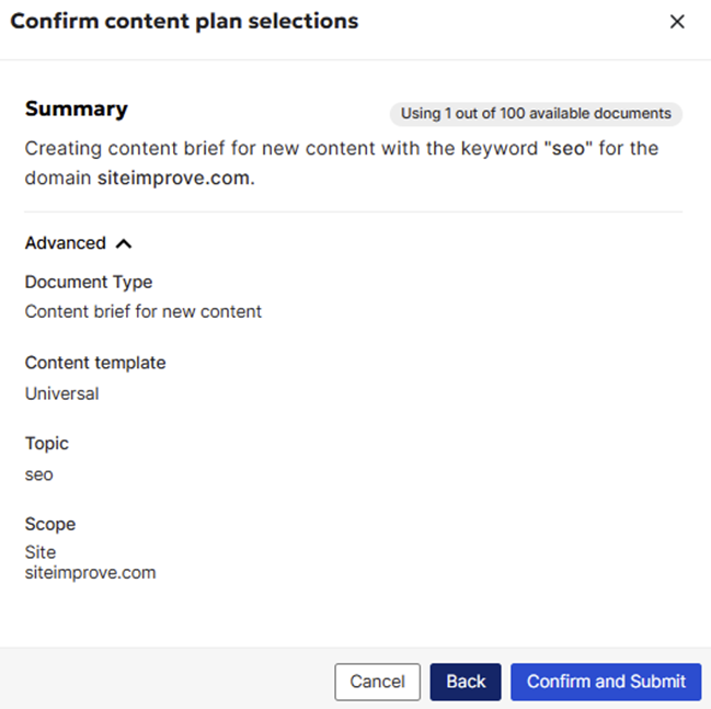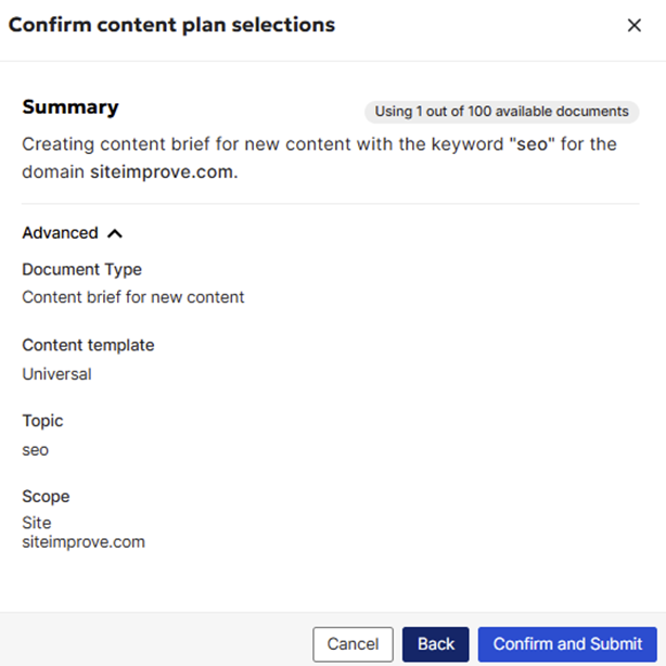 3.2.3 Confirm the content plan selection. Just like with new content, the tool will suggest a content brief plan configured for optimization of the existing content. Review the suggested plan and confirm it. (The Advanced section is collapsed by default here as well, to avoid overwhelming you with technical details – you can leave it as is for a quick brief.)