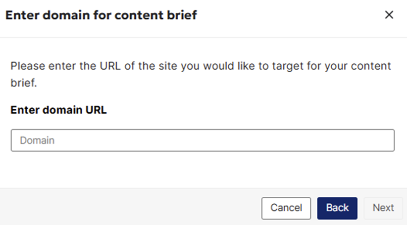 3.1.1 Enter the domain or URL for the new content. Once you select the new content option, you’ll be prompted to specify the domain (or website URL) where this content will be published. This ensures the brief is tailored to the correct site or client.