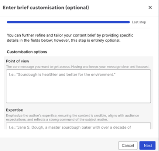 3.1.2 Here, the user can either add a keyword/topic they would like to target. Picking a keyword ensures the brief aligns with your ongoing SEO strategy.